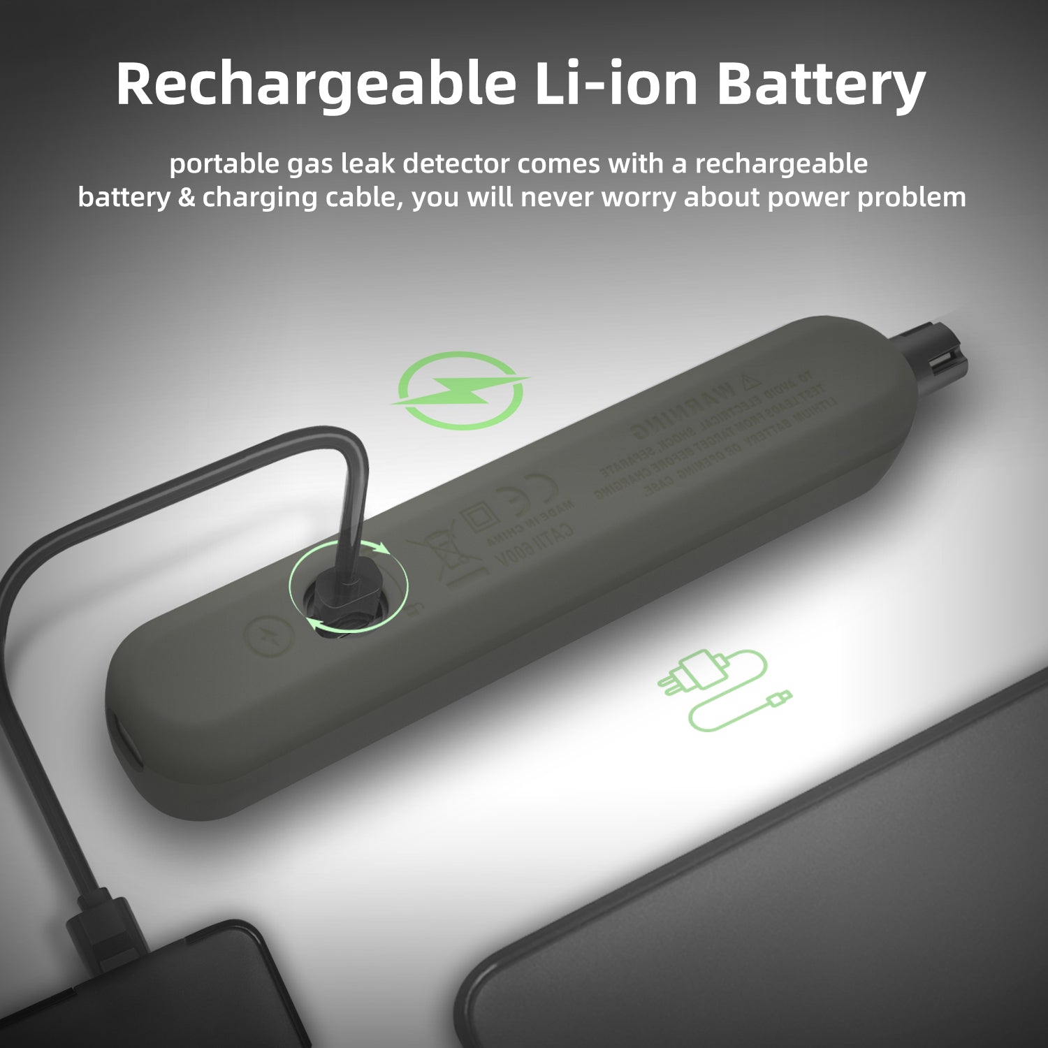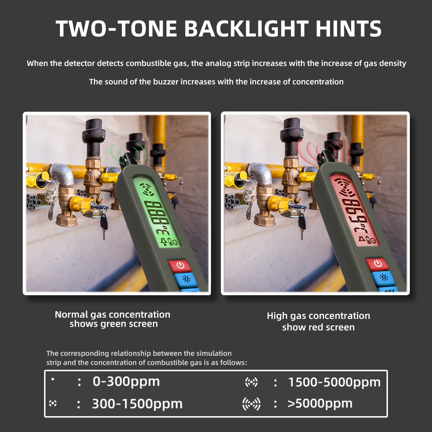 3.Dual color backlight prompt: When the detector detects combustible gas, the simulation bar increases with the increase of gas density, the buzzer sound accelerates with the increase of concentration, and the motor vibration strengthens with the increase of concentration